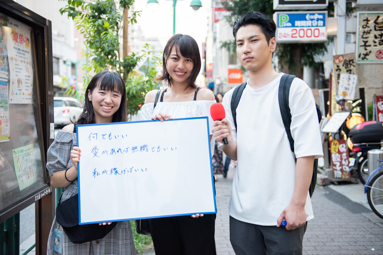 恵比寿での調査もまた人それぞれの意見が出てきましたが、キーワードとして出てくることが多かったのは「安定」。年収や職種にはこだわらない人もいれば、高収入の職業、果ては相葉雅紀や松坂桃李を求める人など、様々な意見が出ました。