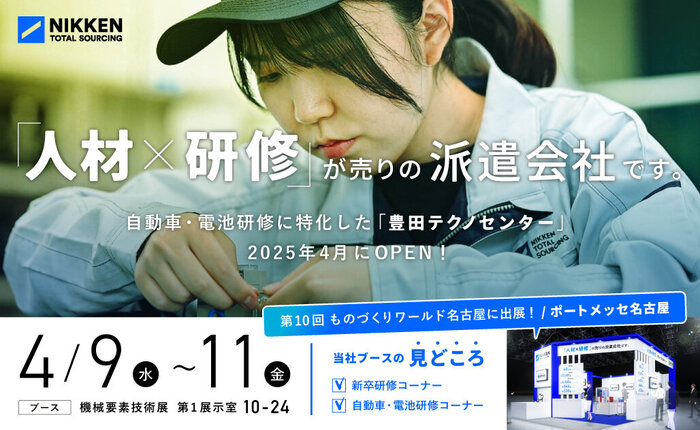 多様な人材を人的資本と捉え、人材ソリューションで可能性を創造する「人的資本創造企業」の日研トータルソーシング株式会社(本社:東京都大田区)は、4月9日(水)~11日(金)にポートメッセなごやで開催される「第10回 ものづくり ワールド (名古屋)」に出展いたします。