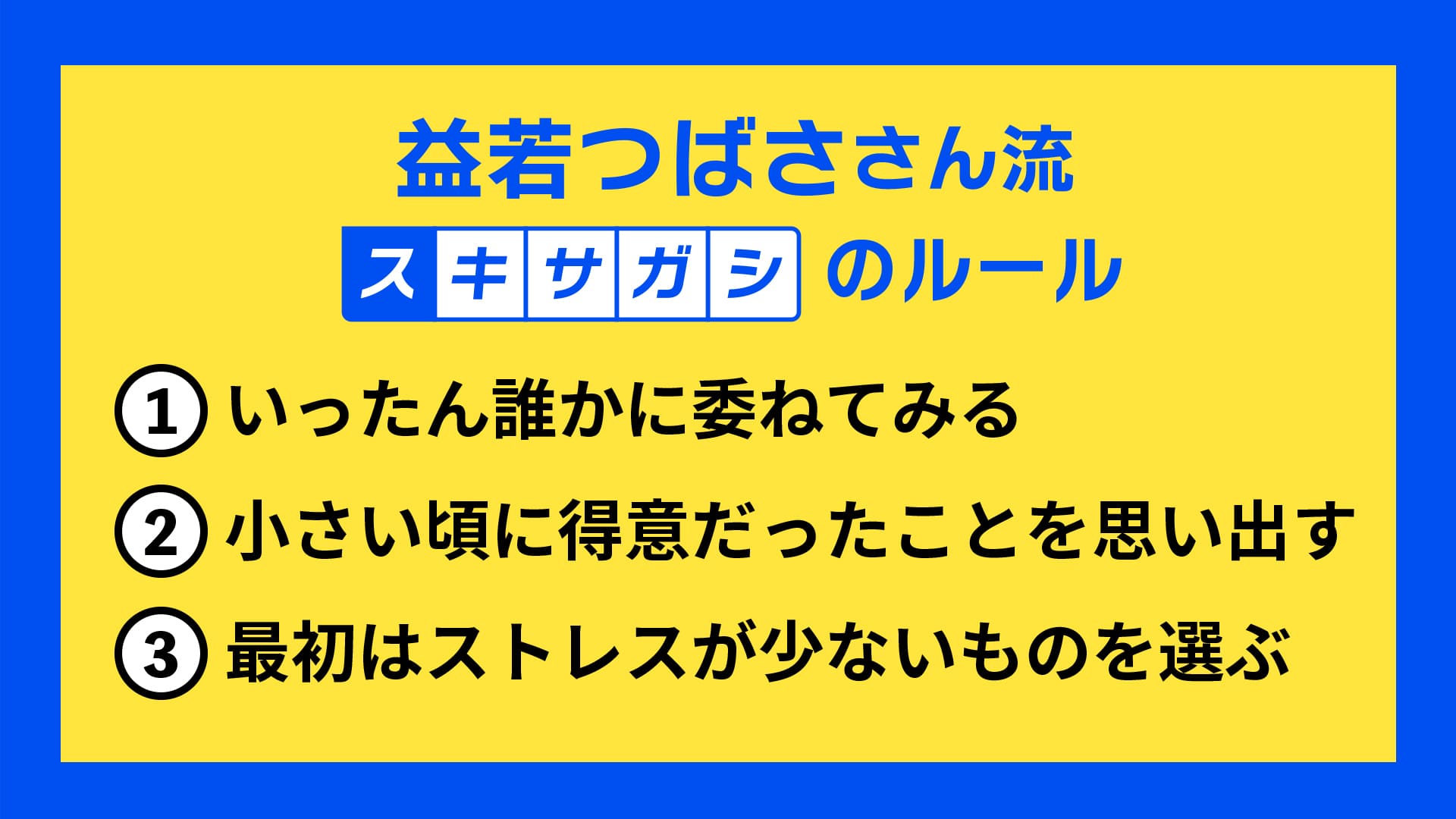 益若:迷ったり困ったりしたときは、幼少期から自分を振り返ってみてください。どんなことで褒められていたか、何が得意だったか。小さい頃の得意なことって、意外と大人になっても残っています。「人に教えるのが好きだったな」とか「自分の意見を言うのは得意じゃないけど、言われたことをまじめにやるのは得意だったな」とか。そういうものを選ぶと、ストレスが少ないはず。まだ「これがやりたい」とはっきり言えない人も多いと思いますが、最初から好きなことを見つけようとしなくて大丈夫。まずはあまりストレスを感じずに続けられることを基準に選ぶのも立派な選択だと思います。