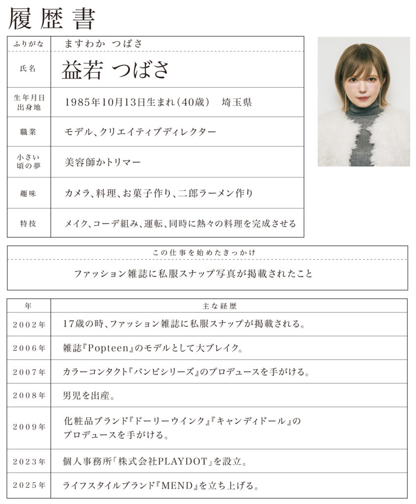 益若:そうです。「家にいてもできる仕事があるよ」と言われて。当時は、モデルや芸能人が商品をプロデュースする例はほとんどなかったので、今思うと提案してくれた人には先見の明がありましたよね。撮影のたびに私が「こんなつけまつ毛があったらいいのに」「これとこれを組み合わせたら、もっとかわいいのに」と話しているのを見て「つばさに任せてみたら、いい商品ができるかも」と思ってくれていたみたいなんです。