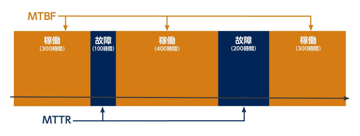 平均故障間隔とは、平均してどのくらいの期間に1回の故障が起きているかを示す値で、MTBFの値が高いほど故障が起きにくく、信頼性が高い設備と評価できます。