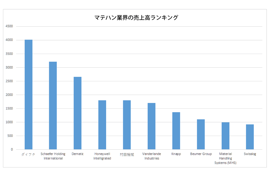 自動倉庫などのマテハン機器の世界シェアトップを誇るのは日本のダイフクで、その売上高は40億1600万ドルにも上ります。なお、2位のSchaefer Holding International(シェーファー・ホールディング・インターナショナル)の売上高は32億1700万ドル、3位のDematic(デマティック)は26億6200万ドルです。