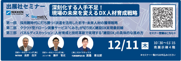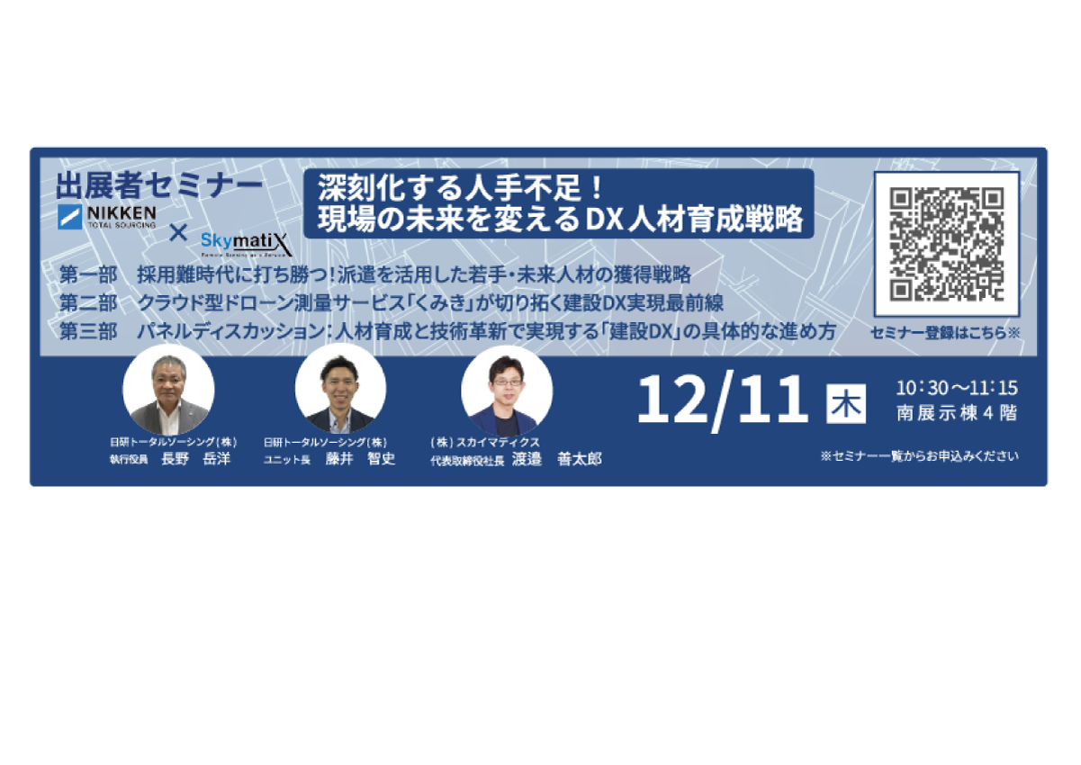株式会社スカイマティクスとの共催セミナーを実施いたします。建設業界の人手不足解消に向け、「人材×デジタル」で現場力を高める最新のDX戦略をご紹介します。本セミナーを通じて、これからの現場づくりに役立つ実践的なヒントをお届けします。皆さまのご参加を心よりお待ちしております。
