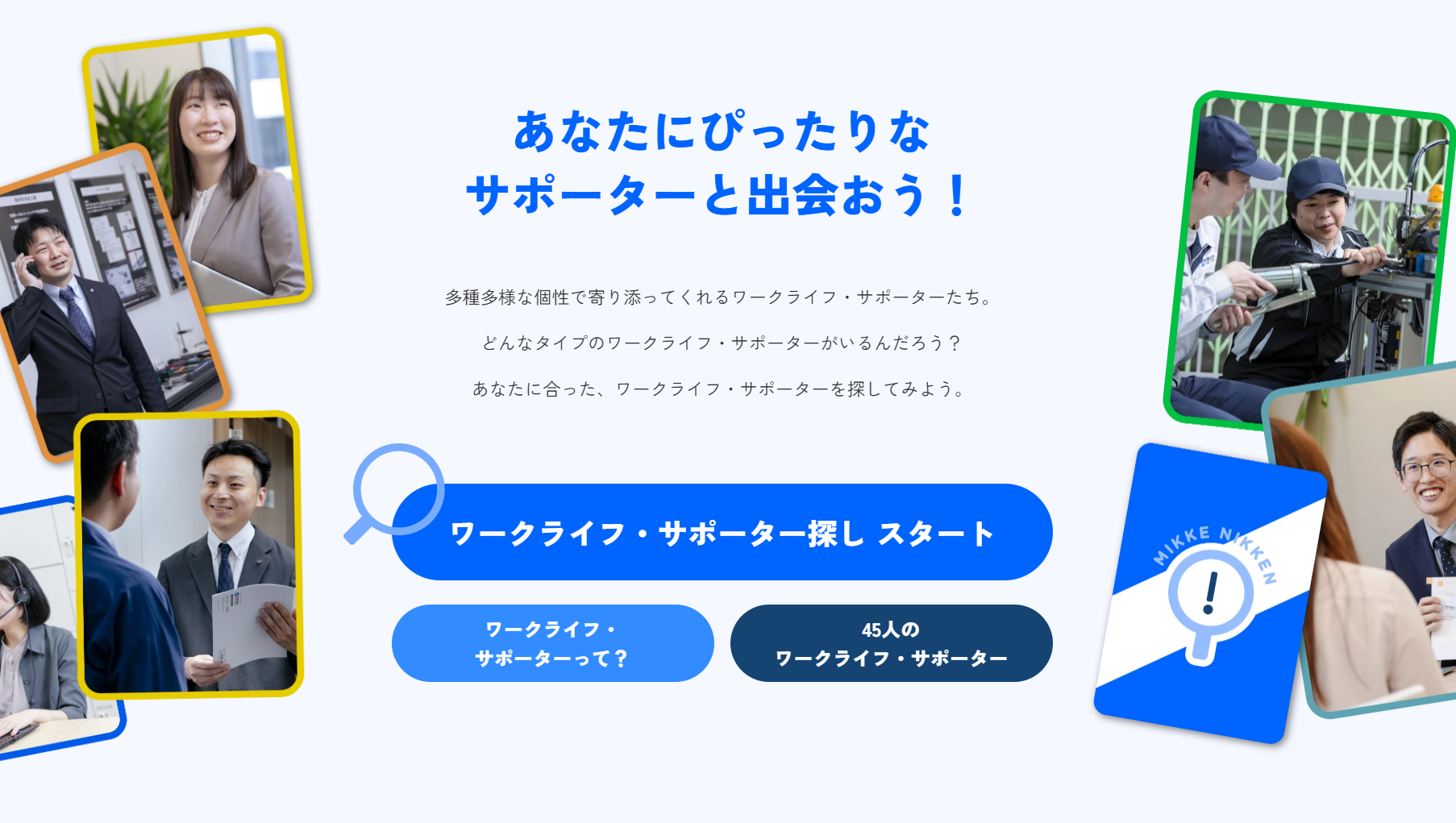 本サイトでは、「私らしさを支える、色とりどりのワークライフ・サポーターたち」をコンセプトにワークライフ・サポーターを9タイプに分け、働く人が仕事をする上での価値観にあわせたワークライフ・サポーターを見つけることができます。また、それぞれのワークライフ・サポーターの仕事に対する姿勢や大切にしていることを掲載。ワークライフ・サポーターたちがどのような意識でスタッフのサポートを行っているのか、ご自身の価値観にあったワークライフ・サポーターはどんな人物なのかを知っていただけるコンテンツを用意しています。