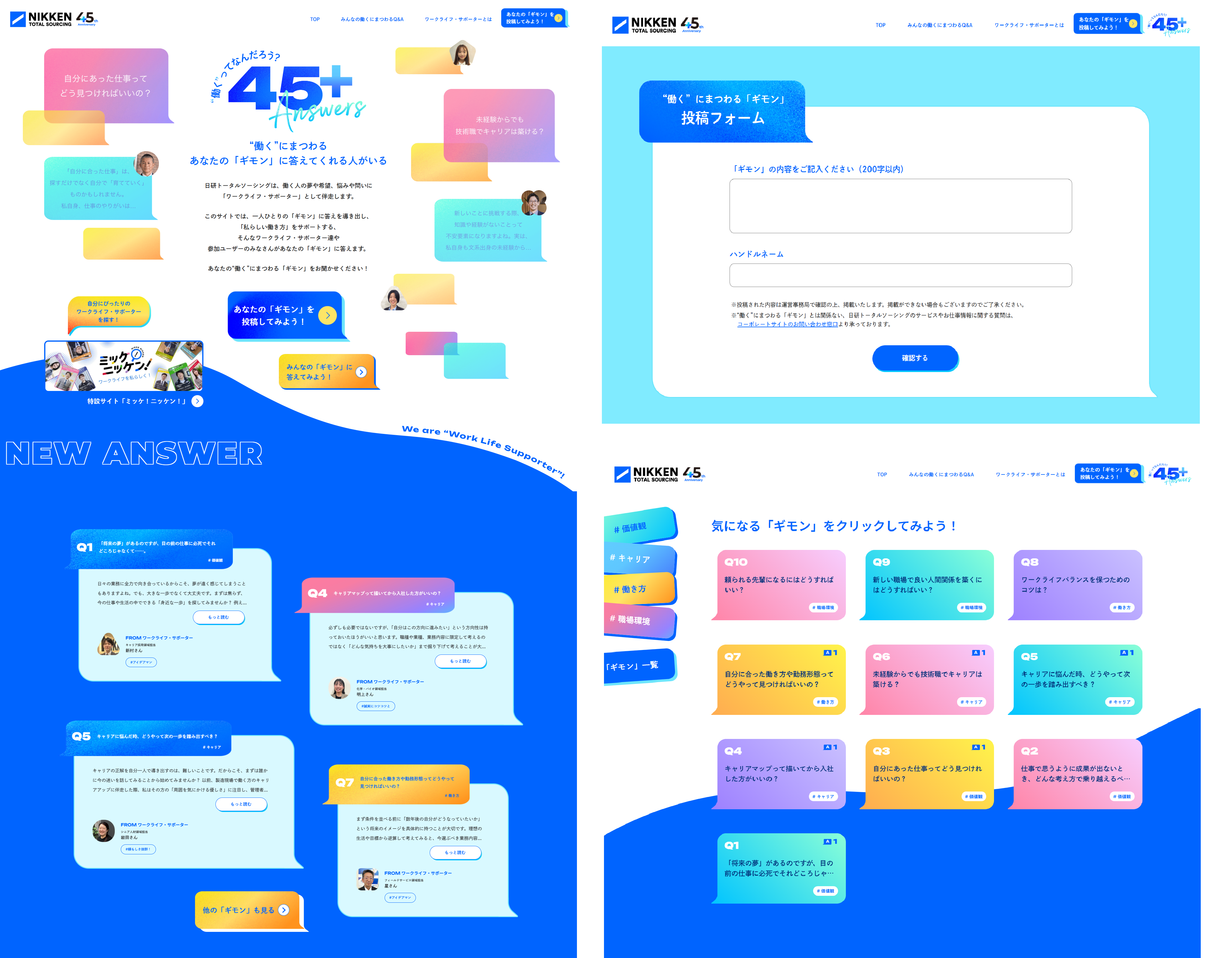多様な人材を人的資本と捉え、人材ソリューションで可能性を創造する「人的資本創造企業」の日研トータルソーシング株式会社(本社:東京都大田区)は、2026年4月に創業45周年を迎えます。この度、2025年9月に開設した創業45周年特設サイト「ミッケ︕ニッケン︕ワークライフを私らしく︕」に続く第2弾として、ユーザーから寄せられる「働く」にまつわるギモンに当社のワークライフ・サポーターやユーザーが回答するコンテンツ「"働く"ってなんだろう?45⁺Answers」を公開いたしました。