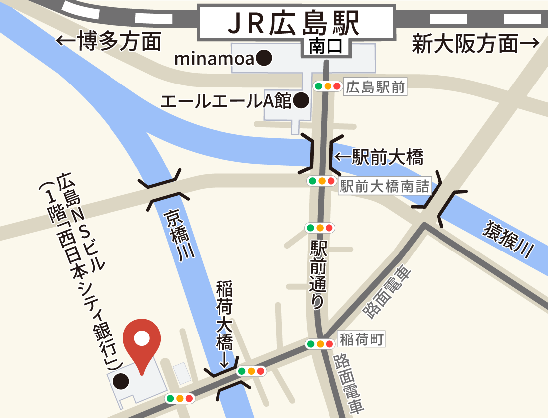 広島駅南口(在来線口)を出て、駅前の大通り(駅前通り)へ向かいます。進行方向に向かって右側の歩道を進み、川にかかる大きな橋(駅前大橋)を渡ります。しばらく道なりに進み、路面電車が通る交差点(稲荷町)を右へ進んでください。稲荷大橋を渡ってすぐ右手にある二つ目の大きなビルの6階です。1階の銀行の左手にあるビル入口からお入りください。