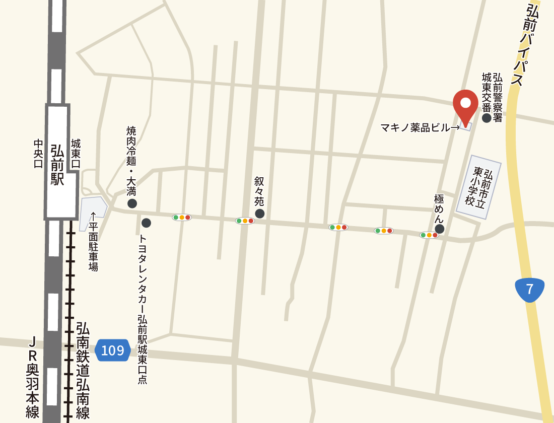 JR弘前駅・城東口を出て駅を背にして右に歩道を進みます。駅ビル、駐車場の前を道なりに進むと 4差路がありますので、左手に「焼肉冷麺・大満」右手に「トヨタレンタカー弘前駅城東口店」がある通りを直進します。更に「叙々苑」なども通り過ぎ信号を5つ越えます。5つ目の信号の先左側に「極めん」というラーメン屋が見えますので、通り過ぎて左折してください。左折したらそのまま300mほど直進します。「弘前市立東小学校」を過ぎ 左側にある3階建ての茶色い建物です。「弘前警察署城東交番」の手前となります。