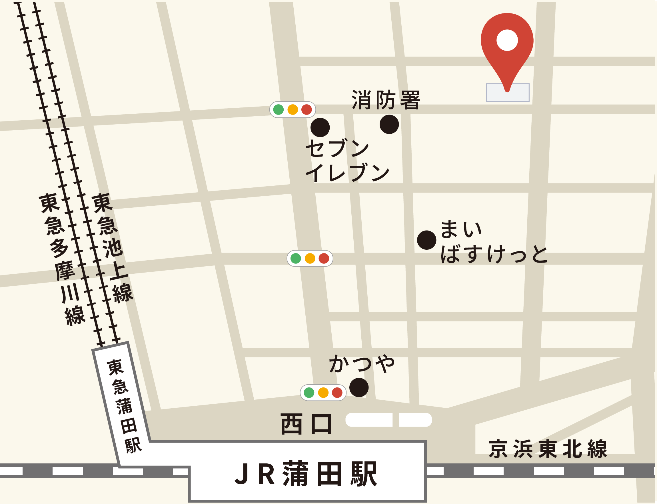 JR蒲田駅・西口を出て「ドン・キホーテ」側へ進み、すぐ左の大通りを「日本工学院」方面へ進みます。
