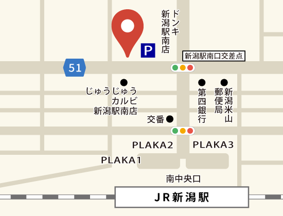 JR新潟駅・万代口を出て東大通り(県道33号線)を直進すると、左手にある「ファミリーマート」の隣の「第3マルカビル」の6階です。