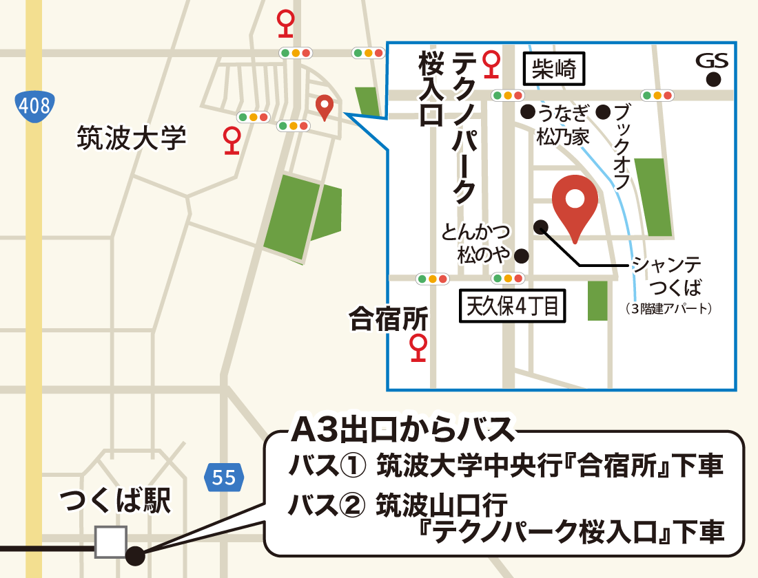 3駅目の「テクノパーク桜入口」で下車します。バスで進んできた道を戻り交差点(柴崎)で横断歩道をうなぎ料理店「松乃家」側に渡り、「松乃家」を過ぎた次の角を左折し、すぐ右折します。そのまま直進すると左手に「シャンテつくば」(3階建てのアパート)が見えて来るので左折し、100メートルほど進んだ右手のベージュと黒の建物です。