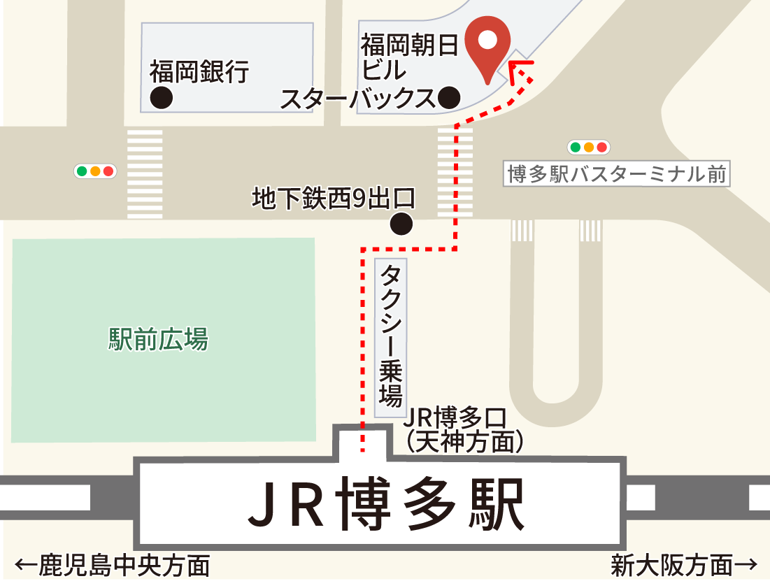 JR博多駅を博多口から出てすぐ向かい、横断歩道を渡って1階にスターバックスがある「福岡朝日ビル」の5階です。